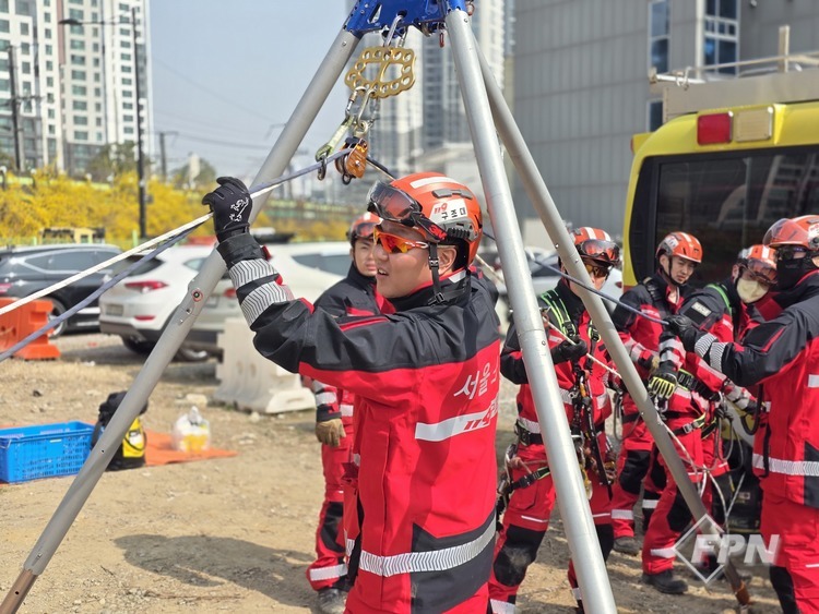 [FPN 정재우 기자] = 용산소방서(서장 서영배)가 지난 26일 오전 9시 30분~오후 5시 30분 성동소방서 뒤편 중장비 주차장에서 지반침하(일명 씽크홀) 사고에 대비한 현장대응훈련을 실시했다.