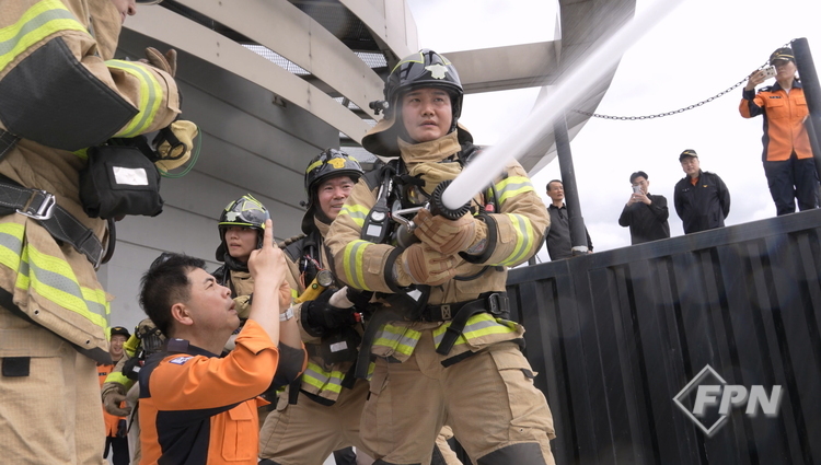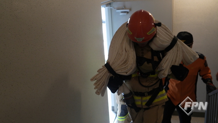 화재 대응훈련은 301동 35층에서 화재 발생 상황을 가정해 진행됐다. 소방대원들은 지상에서부터 35층까지 수관을 전개해 가상 화재를 진압했다. 이를 통해 30층 이상 고층건축물 화재 시 장거리 수관 전개 능력과 현장 대응 역량을 집중적으로 점검했다. 30층 이상 고층건축물 화재의 경우 고압으로 방수하기 위해서는 일반수관이 아닌 고압수관을 전개해야 한다.