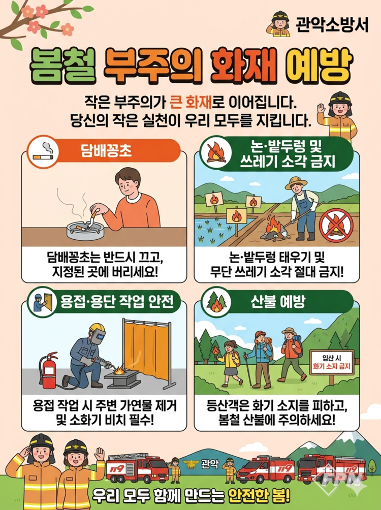[FPN 정재우 기자] = 관악소방서(서장 정윤교)는 건조한 날씨와 야외활동 증가로 화재 위험이 높아지는 봄철을 맞아 시민들에게 부주의 화재 예방을 당부한다고 2일 밝혔다.