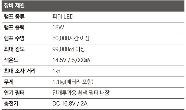 5개의 멀티 렌즈를 활용한 광학 줌 방식으로 7~21° 사이의 가변적인 배광이 가능하며 1㎞에 달하는 조사 거리를 구현해 현장 대원에게 강력한 광도를 제공합니다. 결상광학 줌 시스템 적용으로 광 편차율 20% 이내의 균일한 조도를 유지하며 원거리 시인성을 높인 게 특징입니다.