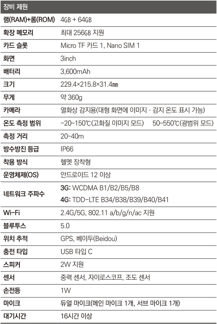 무게는 약 360g에 불과합니다. 접착이나 후크 방식을 적용해 어떤 헬멧이든 손쉽게 장착할 수 있습니다. 이와 함께 3600mAh 대용량 배터리를 탑재해 최대 216시간의 대기시간을 제공합니다. IP66 방수ㆍ방진 등급을 갖춰 혹독한 재난현장에서도 안정적으로 작동합니다.