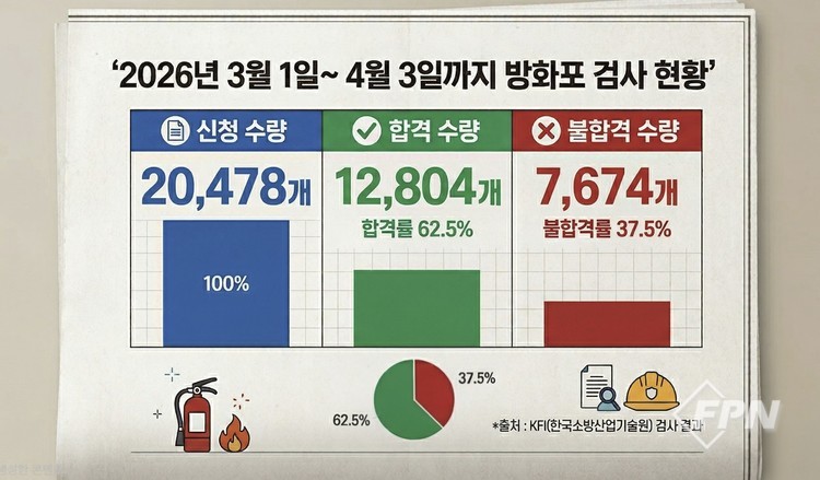 <FPN/소방방재신문> 취재결과 소방법에 따라 방화포의 성능인증을 받은 기업은 7개사로 파악된다. 하지만 법 시행 시점인 3월 1일부터 현재(4월 3일)까지 KFI의 법정 검사를 통과한 수량은 2만478개 검사 신청 수량 중 1만2804개뿐이다. 나머지 7674개에 달하는 제품이 검사 자체를 통과하지 못했다. 시중 공급 방화포 수량이 모자란 데 더해 생산 제품 10개 중 4개(37.4%)가 검사 과정에서 탈락하고 있는 셈이다.