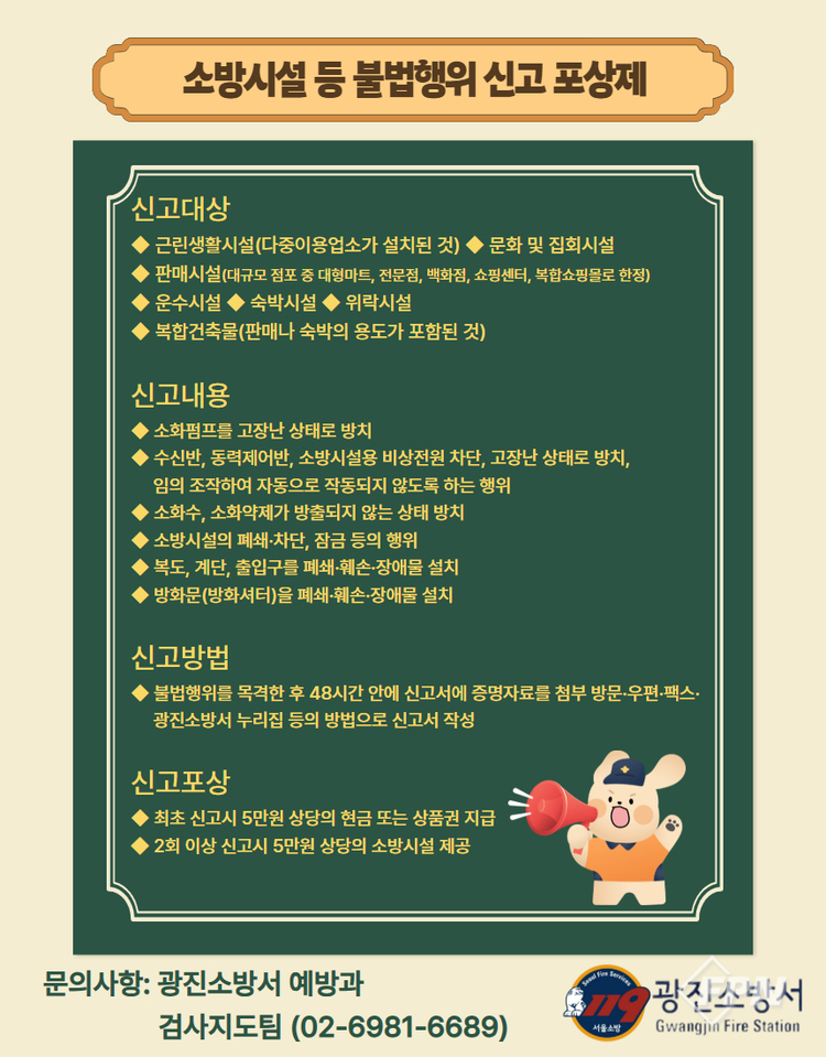 [FPN 정재우 기자] = 광진소방서(서장 박용호)는 소방시설의 유지ㆍ관리 실태를 개선하고 화재 예방을 강화하기 위해 ‘소방시설 등 불법행위 신고포상제’를 연중 운영한다고 6일 밝혔다.