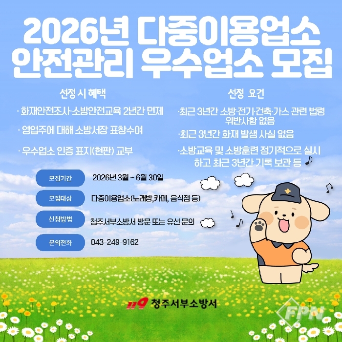 [FPN 정재우 기자] = 청주서부소방서(서장 이학수)는 2026년 다중이용업소 안전관리 우수업소 선정을 위해 흥덕구ㆍ서원구 내 업소의 신청을 받는다고 8일 밝혔다.