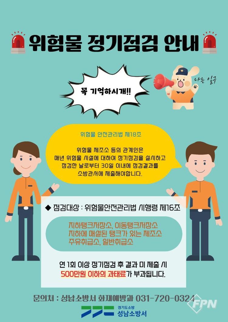[FPN 정재우 기자] = 성남소방서(서장 이제철)는 위험물 취급시설의 안전관리 강화를 위해 ‘위험물안전관리법’에 따른 제조소등 정기점검 이행을 당부한다고 21일 밝혔다.