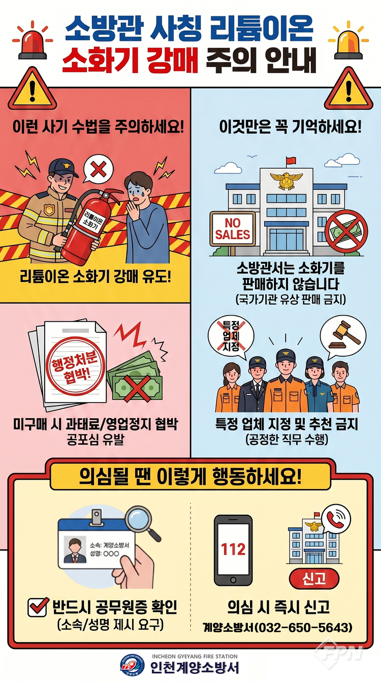 [FPN 정재우 기자] = 계양소방서(서장 송태철)는 최근 소방공무원을 사칭해 리튬배터리용 소화기 등 물품 구매를 요구하는 사기 행위가 발생하고 있어 각별한 주의를 당부한다고 21일 밝혔다.