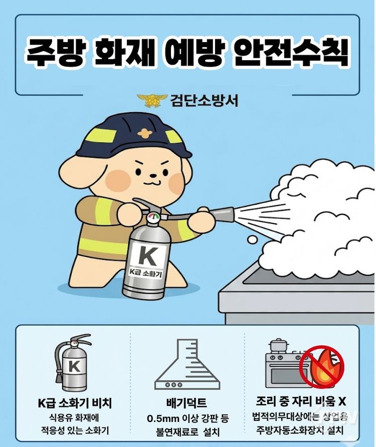 주요 내용은 ▲식용유 화재에 적응성 있는 K급 소화기 의무 비치 ▲불티가 옮겨붙기 쉬운 주방 배기 덕트는 0.5㎜ 이상 강판 등 불연재료로 설치(의무) ▲조리 중 절대 자리 비움 금지 및 집단급식소ㆍ대규모 점포 내 음식점 등 의무 대상의 상업용 주방자동소화장치 설치 등이다.