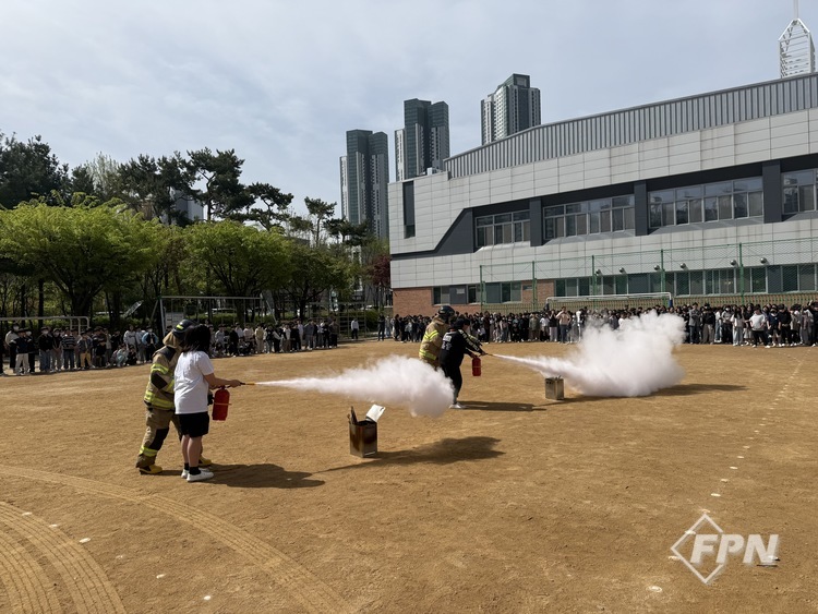 훈련은 ▲화재 초기 진화와 연소 확대 방지를 위한 자위소방대 역할 교육 ▲학생ㆍ교직원 대상 소화기ㆍ옥내소화전 사용법 교육 ▲화재 발생 상황을 가정한 초기 대응ㆍ대피 ▲소방차량 진입로 확보 및 부서 위치 확인 등으로 진행됐다.