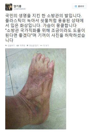 지난달 30일 양씨는 SNS를 통해 소방관의 발이라며 사진을 공개하면서 “국민의 생명을 지킨 한 소방관의 발입니다. 플라스틱이 녹아서 쇳물처럼 용융된 상태에서 입은 화상입니다. 가슴이 뭉클합니다”라며 “‘소방관 국가직화를 위해 조금이라도 도움이 된다면 좋겠다’며 기꺼이 사진을 허락하셨습니다”라고 공개했다. 이 사진을 접한 네티즌들은 ‘이보다 아름다운 발이 있을 수 있을까요’, ‘존경합니다. 소방관님...가족이어도 화마에 쉽싸인 가족을 구하러 들어가기가 겁이 나는데. 생명을 살리겠다는 마음으로 한 번 얼굴도 보지 못한 사람을 구하러 들어가시는 거 정말 어려운 일이죠. 이런 분들 국가직화 되어야하지 않나요?’ 등 응원의 메시지가 올라왔다. 또 안타까운 마음에 눈시울을 붉히며 네티즌들은 세상에서 가장 아름다운 발이라는 찬사가 이어지고 있다. 최고 기자 go@fpn119.co.kr <저작권자 ⓒ FPN(소방방재신문사ㆍ119플러스) 무단전재 및 재배포 금지>