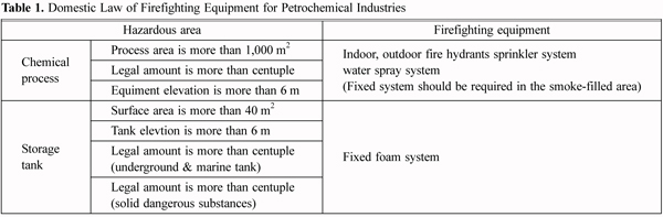 Table 1은 위험물안전관리법에서 규제하는 소화설비를 나타낸 것으로 소화난이도 등급 1에 해당하는 제조소 등에는 옥내 · 옥외소화전설비, 스프링클러설비, 물분무등 소화설비 중 적응성 있는 설비를 설치토록 하고 있으며 화재발생시 연기가 충만할 우려가 있는 장소에는 스프링클러설비 또는 이동식 외의 물분무등 소화설비를 설치토록 규제하고 있다. 소화용수의 경우 옥내 · 옥외소화전, 스프링클러설비 및 물분무 소화설비는 최소 30분 이상 확보하도록 규제하고 있으나, 공정위험도, 위험물 취급량 등을 고려하여 소화시간을 정하고 소화수원을 확보는 것이 필요할 것으로 사료된다.