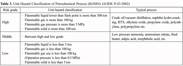 또한 소화용수의 경우 정유공장은 최대유량으로 4~6시간 이상 충분히 공급할 수 있을 정도의 수원을 확보하도록 권고하고 있다. 2.3 국내 정유사 소화설비 기준 원유정제, 납사열분해 등 고위험 공정을 보유하고 있는 정유사의 경우 소화설비 설계 시 API 또는 NFPA CODE 등을 참고하여 자체 강화된 기준을 적용하고 있다. 공정화재시 복사열로부터 주위설비 보호를 위하여 위험도가 높은 펌프, 압축기 및 공기냉각기 등 설비에는 고정식 물분무 소화설비를 설치하도록 하고 있으며, 소방차의 접근이 어려운 지역에는 공정 상층부에 모니터 노즐(elevated monitor nozzle)을 설치하여 방호대상물에 대한 사각지역이 발생하지 않도록 하고 있다. 공정지역에 필요한 소화용수 공급량은 해당 공정지역의 면적 및 원료처리량을 고려한 소요량과 물분무설비의 최대 소요량을 합산하여 산정하는데 특히 원유정제, 납사열 분해 등 고위험공정의 경우 소화용수 최대유량이 2,000m3/h 이상으로 4시간~6시간 이상 공급 가능하도록 설계하고 있으며, 소화수원은 10만 m3 이상 충분히 확보하고 있는 것으로 나타났다. 3. 울산국가산업단지 석유화학업체 소화용수 현황 3.1 개 요 본 연구에서는 울산국가산업단지의 석유화학업체 32개사에 대하여 소화용수 현황을 조사하고 안전관리 관계자들의 의견 파악을 위해 설문조사를 실시하였으며 주요 조사내용은 다음과 같다. · 각 사 소화용수 소요량 대비 공급량 적정여부, 소화시간, 소화수원 확보 현황 · 석유화학공장에서 고정식 물분무소화설비의 설치 필요성 및 소화시간에 관한 의견 · 기타 석유화학공장의 소화설비 개선에 필요한 의견 등 3.2 조사결과 분석 울산국가산업단지의 석유화학업체 32개사의 주요 공정화재 시나리오에 따른 소화용수량, 소화수원, 포소화약제 보유현황 등에 대한 조사결과는 Table 5와 같다. 여기서 고위험공정은 unit hazard classification에 따라 crude/vacuum distillation (over 100,000b/d), hydroracking, butadiene recovery, ethylene (compression & fractionation), propylene oxide, polyethylene (high pressure unit)으로 분류한다.