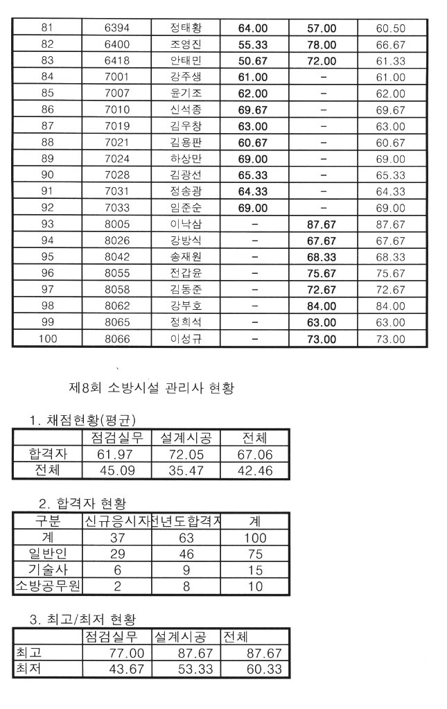 제8회 소방시설관리사 자격시험 최종합격자 아래와 같다. ![]() ![]() 최종합격자는 2005. 9. 20(화)부터 2005. 9. 30(금)까지 소방방재청 소방정책과에 방문하여 소방시설관리사증 및 소방시설관리사 자격수첩을 교부받아야 한다. 방문시 사진 3매(가로 5㎝×세로 7㎝ 1매, 가로 3.5㎝×세로 4.5㎝ 2매)를 지참해야 하며 사진을 16일까지 소방정책과로 등기로 보낸 합격자는 현장에서 본인확인후 바로 발급가능하고 이외에 주민등록증이나 운전면허증 등 본인을 확인할 수 있는 신분증은 필히 지참해야한다. 소방정책과 안내(☎ 02-3703-5240) - 주 소 : 서울특별시 종로구 적선동 122-1번지. 한국생산성빌딩 2층 - 교통편 : 지하철 3호선 경복궁역 6번 출구와 지하연결, 지하철 5호선 광화문역 1번 출구 정부중앙청사 후문방향 도보 5분거리 <저작권자 ⓒ FPN(소방방재신문사ㆍ119플러스) 무단전재 및 재배포 금지>