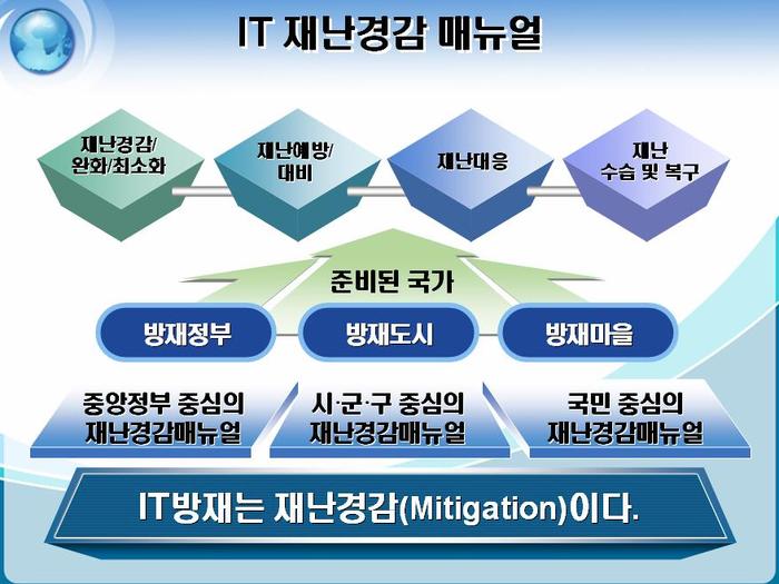 2003년 태풍’매미’에 의하여 상당한 피해를 입었을 때, 공영방송에서 “태풍에 대응하는 매뉴얼을 갖고 있느냐”고 재난관리책임자에게 물은 적이 있다. 이때 “지금 만들고 있는 중이다.” 라고 답한 것이 기억난다. 정확한 답변이었지만 상호간에 의사전달이 제대로 이루어지지 않아서 설왕설래 했던 뉴스의 한 장면이 기억에 남아 있다. 미국 재난관리청의 웹사이트에서 검색하면 관련 기사 및 서류가 무려 752개나 제공하고 있다. 미국은 매뉴얼을 만들어 놓은 것도 있지만 지속적으로 변화관리 하고 있다. 이러한 재해재난관련 매뉴얼은 3개 분야로 구분하여 볼 수 있으며, 이는 중앙정부 중심의 매뉴얼, 시군구 중심의 매뉴얼, 국민 중심의 매뉴얼 등으로 나누어 진다. 미국의 재난관리청에서 ‘it재난경감 매뉴얼’을 검색하여 위의 세 분야 매뉴얼인 867개의 문서 및 정보가 검색된다. 이 중에서 특히 관심을 끄는 문서는 재난 발생 전 재난경감에 기반을 둔 방재마을을 위한 재원 매뉴얼이다. 첫째로 중앙정부 중심의 매뉴얼에 대하여 살펴보자. 우리나라는 ‘국가위기관리기본지침(대통령훈령 제124호)’에 의거하여 국가의 안보/재난/국가핵심기반의 위기를 관리하는 매뉴얼에 갖고 있으며, 국무총리가 위원장인 국가안전관리중앙위원회에서 국가안전관리기본지침을 발표하고 이를 바탕으로 정부 유관부처 및 지자체, 관련 관공서에서 해당 실무매뉴얼 2005년 판을 만든 바 있다. 이러한 내용이 반영된 것이 국가안전관리시스템이다. 전산시스템인 it 시스템적으로는 법개정에 따라가지 못하고, 아직 미완성이 상태에 있으며, 국가안전관리사업 2단계 isp/bpr 사업에 의하여 이러한 it시스템에 대한 재설계를 하여 놓고 있다. 이 시스템이 있어야 하는가 없어야 하는가에 대하여 정부 및 국회에서는 많은 이야기를 하지만, 핵심을 이해하고 나면, 국가의 국가안전관리시스템은 꼭 필요한 것임은 두말할 필요가 없는 사실이다. 둘째로 시군구 중심의 매뉴얼에 대하여 살펴보자. 중앙정부에서 제시한 기준에 준하여 234개 시군구 재난관리담당자들은 방재도시를 위한 지역별 안전관리 매뉴얼을 2005년도에 작성하였으며, 이 매뉴얼에는 해당 재해재난을 당한 경우에 대처하기 위한 방안으로서, 각 지역의 식음료, 전기, 통신, 토목, 건축 등에 이르는 다양한 분야의 전문가 및 관련 기관인 소방서, 경찰서, 관공서 등의 연락 대상이 기록되어 있다. 지방정부들은 재난의 유형 중에서 시군구에 해당되는 내용을 선정하여 이를 재난관리 매뉴얼로 비치하여 놓고 있다. 마지막으로 국민 중심의 매뉴얼에 대하여 살펴보자. 방송에서 항상 국민이 긴급한 재해재난 시 이용할 수 있는 매뉴얼이 없다고 지적을 하고 있다. 그렇지만 막상 너무나 다양하여 이 매뉴얼을 어떻게 만들 것인가에 대하여는 많은 의견이 제시되고 있다. 이를 국민행동 매뉴얼이라고 부르고 있다. 미국은 재난을 당할 수 있는 상황의 국민들에게 재난에 대응하는 행동매뉴얼을 제공하여 주고 있으며, 중요한 사실은 이러한 행동 매뉴얼이 각 지역의 특색에 알맞게 만들 수 있도록 방법론을 제시하고 있다는 사실이다. 이러한 방법론을 여기서 간단하게 소개하여 보고자 한다. 여기서 소개하는 자료는 재원 안내(resource guide) 자료는 미국 재난관리청 자료(http://www.fema.gov/pdf/mit/resource_guidefinal.pdf)에서 참고한 것임을 밝혀 둔다. 이는 방재마을 단위에서 자체적으로 매뉴얼을 만드는 방법으로서, 그 지역의 전문가들이 모여서 다음과 같은 목적을 위하여 45분에서 1시간 30분 정도 논의하면서 만들어진다. 논의되는 내용으로서는 지식, 요구사항, 관심도, 태도 등의 평가, 공감하는 분야 만들기, 공감대 형성하기, 데이터 수집 및 분석, 연습 반영, 논의 착수, 학습 구조화, 이전 지식의 단계화 및 신념 등이다. 첫 번째 단계는 자원봉사단체 및 사회봉사단체 자원봉사자가 함께 서로를 이해하고 함께 일하는 단계이다. 이때 이를 진행하기 위하여 지역파수꾼인 재난관리사가 함께 참석하여 일을 진행하여 주어야 한다. 위기에 직면한 지역사회를 위한 커뮤니티 위기평가를 기반으로 테러에 대한 우려를 줄일 것인가? 어떻게 하면 테러, 경보음, 비상 통신시스템, 날씨 알림 시스템, 평가 계획, 비상시 도구함, 침낭, 연기 경보기 등을 활용하여, 재난을 완화하며 준비물을 점검할 것인가를 논의한다. 재난경감 활동으로서, 태풍 피난처를 설치하고, 강한 밧줄을 준비하고, 태풍과 강풍 시 견디어 낼 수 있도록 단단히 고정하고, 하수구를 청소하고, 단단히 건물을 고정하고, 해일 및 화재 및 거주지에 안전 창문필름 부착 등에 대한 것을 실시한다. 필수품에 대한 점검, 책 선반 고정, 하수구가 역류하는 것을 막기 위하여 관련 밸브를 잠그고, 재난완화 계획을 개발하고 안전한 방을 만드는 것 등의 조치를 취한다. 상호 재난완화 파트너 십의 성공사례를 재난관리청 홈페이지에서 찾아서 함께 공부한다. 전통적으로 미국도 1970년대만 하더라도 대응 및 수습복구 중심으로 이러한 모임이 활동을 하였으나, 그 이후에 준비와 미리 인식함에 대한 중요성을 깨닫고 대안을 찾기 