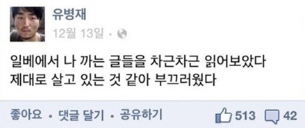 KBS가 보수성향 커뮤니티 '일간베스트 저장소(일베)' 활동 경력이 있는 공채 42기 수습기자를 정식 임용한 가운데 앞서 유병재가 일베를 언급한 글이 다시금 주목받고 있다. 유병재는 앞서 자신의 SNS를 통해 "일베에서 나 까는 글들을 차근차근 읽어보았다. 제대로 살고 있는 것 같아 부끄러웠다"라는 글을 게재해 눈길을 끌었다. 이와 함께 일반인과 일베를 비교한 글을 남기기도 했다. 해당 글에 따르면 일반인의 경우 할머니가 "늙으면 죽어야지"라는 말에 손자는 "그런 말 하지마"라고 답한다. 반면 일베의 경우 이와 반대의 상황일 것이라는 추측글을 남겨 눈길을 끌었다. 한편 KBS는 31일 일명 '일베 수습기자' 정책기획본부 남북교류협력단(일반직 4직급)으로 발령했다. 온라인뉴스팀 online@fpn119.co.kr