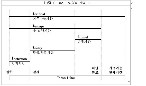 이번 연재부터는 현재 실제 pbd가 어떤 과정으로 주로 수행되고 있는지에 관하여 살펴보기로 하겠다. 이전 연재에서 기술했듯이 현재 pbd는 대부분 확률의 개념을 다루지 않는 결정론적 분석방법(deterministic method)에 의해 수행되고 있다. 그러면 결정론적 분석방법에 의한 pbd에 대해 구체적으로 언급해 보기로 한다. 결정론적 분석 방법에 의한 pbd 에서는 어떤 대상물에 대해서 하나 혹은 그 이상의 예상되는 화재 형태 및 크기, 즉 설계화재시나리오에 의하여 예상되는 화재의 심각도(fire severity) 및 고려되는 방화시스템(fire protection system)의 성능 등을 분석하게 된다. 만약 여러 개의 화재시나리오가 고려되었을 경우는, 각각 독립적으로 분석된 후에 최종적으로 최악의 시나리오(worst case fire scenario)를 방호할 수 있는 대책을 세워야 한다. 결정론적 분석에서 대표적으로 사용되는 기법 중 하나인 타임라인(time line) 분석 방법은 다음 그림1과 같은 절차로 수행된다. 그림1은 time line 분석 방법의 개념에 관한 그림이다. 이 그림에 의한 총 피난 시간은 다음과 같이 표현된다. tescape = tdetection + tdelay + ttravel 여기서 화재 역학 및 시뮬레이션 등을 통해 구할 수 있는 감지시스템의 감지시간 (tdetection)과 재실자 들이 화재에 반응하여 피난을 개시할 때까지의 지연 행위가 고려된 시간(주로 전문가들의 의견 혹은 신뢰성 있는 서적에 의해 가정됨) (tdelay), 그리고 피난시뮬레이션 혹은 sfpe handbook의 계산방법(hand calculation)등으로 구한 이동시간 (ttravel)의 합으로 구한 총 피난 시간 tescape 이 화재시뮬레이션의 결과를 통해 나온 거주가 불가능상태에 도달 하 는 시간 tcritical 보다 적은 경우에는 화재로부터 안전하게 대피할 것으로 가정하고 반대의 경우 즉, tcritical 보다 많은 시간이 걸리는 경우 안전하게 피난하지 못한 것으로 간주한다.
