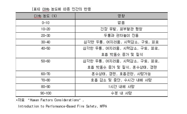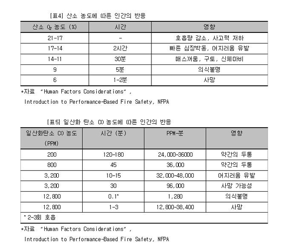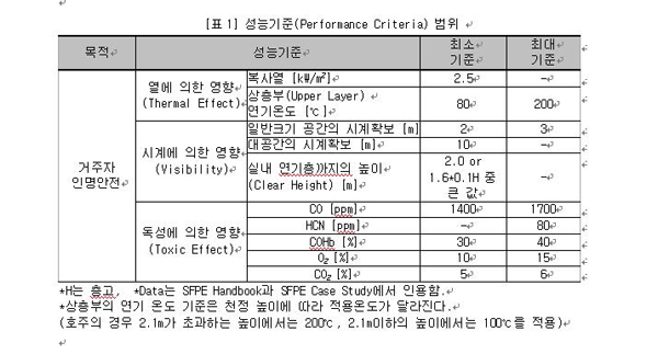 초기 설계가 성공하려면 각각의 성능기준(performance criteria)이 설계화재시나리오의 위험성과 비교하여 만족스러운 안전한 결과를 도출하여야 한다. 이때에 주의해야 할 점으로는 화재 시 발생할 수 있는 여러 가지 불확실성에 대한 고려가 있어야 한다는 것이다. 불확실성을 유발하는 요인에는 여러 가지가 있겠지만 대표적인 것들로서 시뮬레이션 시 고려한 건물자재와 실제로 설치된 자재와의 차이, 설계와 비교한 시공의 불일치, 시간의 경과에 따른 방화 시스템 및 부속품의 변화 그리고 긴급한 상황 발생 시 인간 행동을 예측하기 어려운 점 등이 있을 수 있다. 2. 성능기준(performance criteria) 선택 어떤 pbd 프로젝트의 목표와 범위가 결정되면 그 다음에는 성능평가를 위한 성능기준의 선택이 중요하다. 성능기준은 고려되는 방화시스템이 화재위험 대비에 적정한가를 평가하는 데 사용된다. 성능 기준에는 여러 가지가 상황에 맞게 사용될 수 있지만 대표적인 것들로서 화염의 온도(flame temperature), 연기층의 온도(upper or low layer temperature), 연기의 농도(smoke concentration) 혹은 연기의 높이(smoke layer height), 복사열의 세기(radiation heat) 등이 있다. 성능기준을 설정하고 비교 분석할 때에는 역설적인 언급이 되겠지만 완벽한 화재 안전 환경을 만드는 일은 현실적으로 매우 어렵다는 것을 인식하여야 하며 또한 화재 위험을 낮추기 위해서는 거의 예외 없이 투자금액이 비례적으로 상승한다는 사실을 알고 있어야 한다. 즉 비용과 안전은 거의 반비례 관계에 있는 것이다. 이점을 인식해야만 안전을 추구하는 엔지니어와 투자자간의 화재안전 목표의 합의점을 찾는데 있어서 많은 논쟁이 줄어들 것이다. 다음 표들은 여러 신뢰성 있는 서적에서 제시하는 건축물에서의 인명안전 성능기준의 범위에 관한 내용들을 정리한 예이다.
