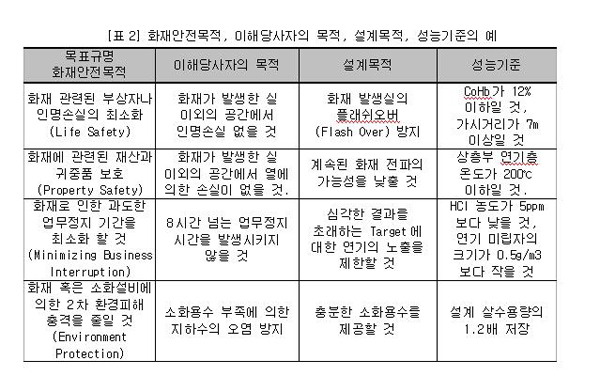 위의 표의 경우도 자세히 살펴보면 상식적인 결과가 많이 포함되어 있음을 알 수 있다. 예를 들어 시계(visibility)에 의한 영향에서 일반크기 대상물의 시계한도가 대공간 시계한도보다 적을 수 있는 것, 즉 다시 말하면 대공간이 화재안전 상 더 긴 시계거리를 확보해야 하는 것은 어찌 생각해 보면 당연한 것이다. 화재 시 일반 가정집보다 체육관 등의 대공간 건물에서 더 긴 시계가 확보되어야 하는 것은 자명한 예측임이 분명하다. 다음으로 [표2]는 실제 적용될 수 있는 pbd의 목표규명 방법 및 이해 당사자 또는 설계의 목적과 성능기준 등에 대해 어떻게 접근해 나갈지에 대한 가이드를 보여주고 있다.