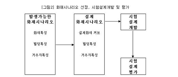 4. 화재시나리오/설계화재/시험설계 개발 pbd에 있어서 화재시나리오는 화재의 심각한 결과를 유추할 수 있는 주요한 요소들의 상관관계를 밝혀 내는 데 주안점을 맞추어야 한다. 그 요소들로는 방화시스템, 점화원, 주된 연료의 특성과 형태, 공조시스템, 거주자의 특성과 위치, 그리고 건물을 지탱하는 구조물의 조건 등에 관한 것들이 있을 수 있다. 건축물의 화재영향평가 및 성능위주설계 시, nfpa 에서는 8개 정도의 시나리오를 고려하는 것을 장려하고 있으며 설계 목적과 범위에 따라 전문가 판단에 의해 어느 정도 까지는 감소된 시나리오를 적용할 수 있는 것으로 기술하고 있다. 화재시나리오를 개발하고 결정하는 절차는 그림2 와 같이 한다.