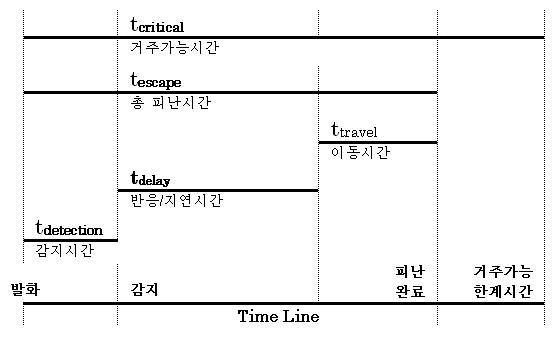 사람의 보행속도는 앞 사람들과의 접근거리에 따라 달라진다. 위의 그림1>에서 보여주는 바와 같이 다른 사람 앞에 있는 사람은 뒤에 위치한 사람의 보행속도를 줄이는 요인이 된다. 사람간의 거리는 사람 몸의 중심간 거리로 표현된다. 계단에서의 속도는 수평에서의 속도와 비교하면 줄어들게 되는데, 계단을 내려갈 때의 속도는 수평속도의 0.5배로 간주했으며, 계단을 올라가는 것은 수평보행속도의 0.35배를 적용하였다. 보통사람의 수평보행속도는 0.8~1.7m/s 범위 내에서 random하게 선택되어 시뮬레이션 하게 된다. 4. 위험의 평가 및 비교 화재시뮬레이션 및 피난계산 혹은 피난시뮬레이션에 의한 결과값을 time-line 분석에 의한 방법으로 평가하여 설정한 성능기준에 따른 거주가능 시간이 총 피난시간 보다 많이 확보되면 거주인원은 화재위험에 대해 안전하다고 평가하며, 거주가능시간이 총 피난시간보다 적으면 거주가능 시간 이후에 대피하는 거주인원은 위험에 처하는 것으로 간주한다. [그림 2] time-line 분석의 예
