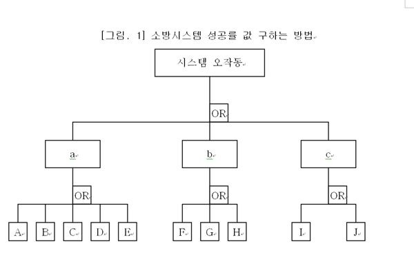 3) 화재안전시스템의 개별적인 요소 평가 건물에 설치되어 있는 각종 화재 안전시설물들의 성능은 건물이 의도하는 목적과 설계 의도에 맞게 시공되어야 하며, 적절한 관리가 필요하다. 또한 적절하게 시공되고 관리된 시설물 모두가 성능을 발휘하는 것은 아니며 각종 예기치 못한 이유에 따라서 failure가 일어날 수 있다. 아래는 성능을 발휘하지 못하는 일반적인 조건을 나열한 것이다. (1) 화재 시 시스템이 반응하지 않을 때(response effectiveness, re) 가. 수동시스템인 경우 작동시키는 시간이 늦었을 때 나. 본질적인 적용이 부적절했을 때 다. 시스템이 부적절하게 설계 되었을 때 라. 시스템의 용량이나 작동 지속시간 등이 불충분할 때 (2) 시스템이 작동하지 못하는 상황 일 때 (on-line availability, ola) 가. 조사나 검사, 관리, 시험 등의 이유로 시스템을 잠시 다운시켰을 때 나. 계획되지 않는 수리나 오작동 등이 발생하였을 때 다. 추운 날씨에 의한 동파 등 불가피한 외부환경에 의해 작동되지 않을 때 (3) 시스템 자체에 오류가 있을 때 (operational reliability, opr) 가. 시스템을 작동 시키는 서브시스템이 고장 났을 때 나. 기계적 결함이나 지진 등의 이유로 작동상의 문제가 발생했을 때 [그림. 1] 소방시스템 성공률 값 구하는 방법