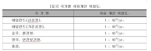 참고로 국가별로 허용되는 개인 위험도는 다음 [표1]과 같다.