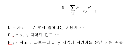 일반적으로 인간에 의하여 만들어진 위험을 관리할 수 있는 한계가 110-6/yr로 되어있다. 반면에 위험도가 110-4/yr로 떨어지면 이것은 수용할 수 없는 위험이 된다. 3. 사회적 위험 사회적 위험은 사고에 영향을 받는 총인원들을 표현하는 방법이다. 이러한 위험에 대한 표현방법은 처음에 원자력산업에서 개발이 되었으며, 이후 화학공학산업으로 적용되어 널리 사용되고 있다. 사회적 위험을 표현하는 방법은 여러 가지 방법이 있으나 이 기준서 에서는 대표적으로 사용이 되고 있는 f-n 커브의 위험표현법을 사용하도록 한다. 인구분산에 관한 것은 하나의 평균인구분산으로 취급되지만, 이는 많은 인원들이 한꺼번에 모이는 사고에 관한 고려는 미약하다. 각 인구분산에 따른 사고 빈도는 인구분산이 일어나는 상대적 확률과 전체 사고 빈도의 곱과 같다. 사회적 위험의 f-n 커브를 계산하기 위한 일반적인 과정은 위험의 크기와 빈도의 고려를 통한 개인적 위험을 구하는 절차와 같다. 사고 결과에 의해 영향이 미쳐지는 인명피해의 수를 계산하기 위해서는 인구에 관한 정보자료를 이용해야 한다. 각 사고 결과에 의해 영향 받는 사람들의 수는 다음과 같이 계산된다.