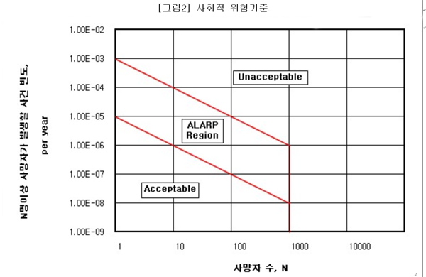 사회적 위험의 기준은 수용 가능한 위험에 대해서는 acceptable, 위험을 낮춰서 수용할 수 있는 범위는 alarp (as low as reasonably practicable), 그리고 수용 불가능한 위험지역은 unacceptable로 표현한다. 수용 가능한 위험 기준을 살펴보면 사망자1명을 기준으로 10-5, 사망자 10명 기준은 10-6, 사망자 100명 기준은 10-7, 1000명은 10-8이 기준이며 1000명 이상의 사망자를 발생하는 사고는 수용 불가능한 위험으로 처리한다. 위의 기준에 따른 사망자수와 사고의 빈도수의 관계에 대한 사회적 위험기준은 아래의 [그림2]에서 표현한다.