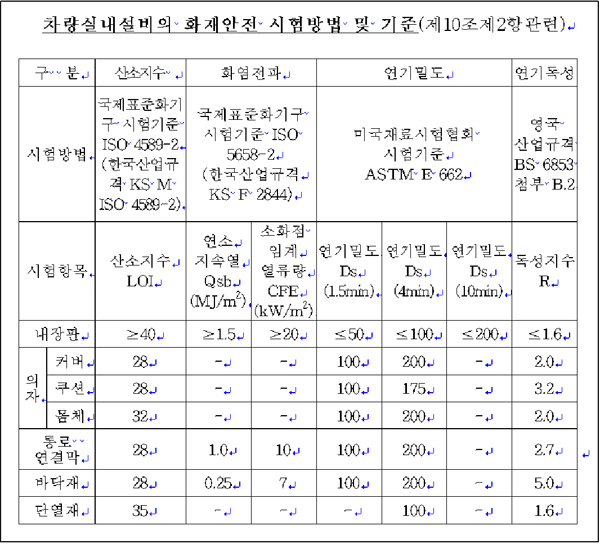 위의 (표 1) 에서도 보는 바와 같이 철도차량 내장재의 종류에 따라 각각의 화재평가시험기기의 종류 및 기준들을 적용사례로 살펴 볼 수가 있다. (구분 우측은 각각의 화재평가 시험기기 종류 및 규격이며 구분 아래 세로는 각각의 철도차량 내장재에 따른 기준이 정리되어 있음)