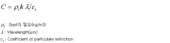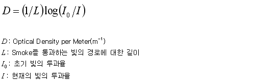 일반적으로 optical smoke measurements의 결과값들은 optical density 또는 light extinction coefficient로 표현된다. 이 두 특성은 본질적으로 같으며, 계산식에서만 다르게 표현된다. 따라서 참고문헌 heat release in fire(edited by v. babrauskas, s.j. grayson)의 chapter. 7 (c) smoke and soot 에서 다음의 계산식들에 관한 공식을 기술한다.