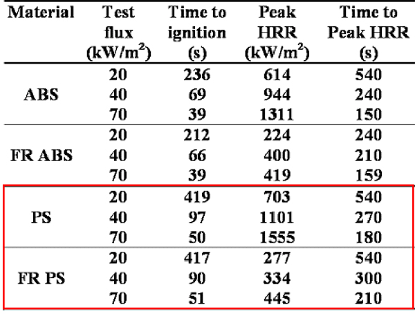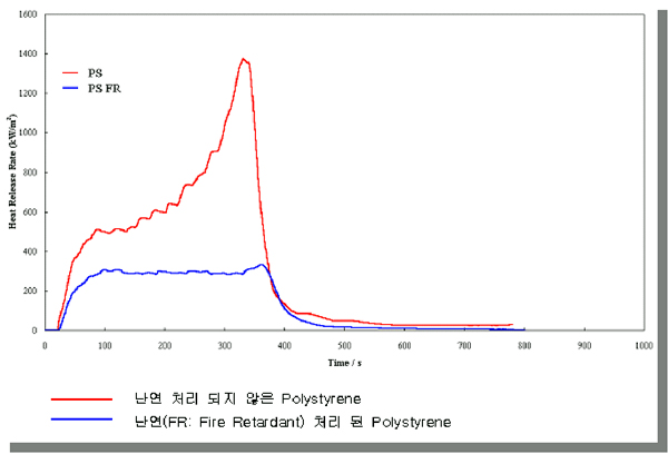 위의 (그림. 3)과 (표. 2)에서 보듯이 난연 처리된 polystyrene과 난연 처리되지 않은 polystyrene의 열방출율의 값의 차이는 (표. 2)의 peak hrr에서 보듯이 3배 정도의 값의 차이를 나타낸다.