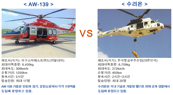 관계자는 또 “우리가 외산 헬기 구매를 위해 국산 헬기의 입찰을 배제하고 있다는 주장은 잘못된 것”이라며 “국산 헬기의 입찰이 가능토록 특별감항증명을 추가로 규격서에 명시한 것”이라고 말했다.