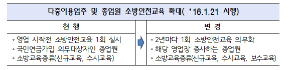 하지만 내년부터는 최대 2년마다 1회의 소방안전교육을 반드시 받아야만 한다. 다중이용업주 외 종업원의 범위도 해당 영업장에 종사하는 종업원 중 1명 이상으로 확대된다.