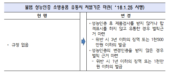 내년부터는 성능인증 후 제품검사를 받지 않거나 합격표시를 하지 않을 때에는 3년 이하 징역 또는 1천500만원 이하, 성능인증의 변경 인증을 받지 않은 경우 1년 이하 징역 또는 1천만원 이하의 벌금형에 처해진다.
