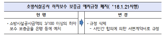 현행 소방시설공사 금액의 3%를 은행 등에 예치해야 하는 의무가 사라진다. 하자담보 책임 이행능력을 확보하기 위한 해당 규정이 폐지됐기 때문이다.