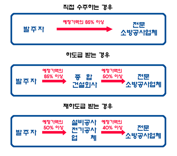 국민 안전과 직결될 수 있는 소방공사를 시행하는 업계에서는 소방시설공사 분리발주 개선을 통해 선진소방공사시스템을 구축해야 한다고 강력히 주장해 왔다. 최근 소방시설공사의 분리발주 도입 내용이 포함된 ‘소방시설공사업법 일부개정법률안’이 입법예고될 예정인 것으로 알려지면서 건설산업과 소방산업의 의견차이가 분분해 적지않은 진통이 예상되고 있다. 이에 본지는 소방시설공사의 일괄발주로 나타나고 있는 현실태의 문제점을 심도있게 짚어보고 분리발주 시행에 따른 소방산업 영향에 대해 조명해 보고자 한다.(편집자 주) 전문적인 소방시설공사업이 소외되다 국내 전기공사업과 정보통신공사, 소방시설공사는 전문성과 안전성, 정확성이 요구되는 특수함을 인정받아 건설공사에 포함되어 있지 않고 별도의 공사업법으로 규정하고 있다. 전기공사와 정보통신공사의 경우 안전확보와 공공이익, 중소전문기업의 육성과 교용안정이라는 사회적 측면에서 유용성이 입증된 분리발주제도를 시행중에 있으며 중소기업의 체질과 경쟁력 강화에 기여하고 시장참여 기회의 형평성 유지, 시공의 전문화, 기술축적 등 유용한 정책 수단으로서 평가받고 있다. 독립되면서도 타 업종과 비교했을 때 법률이나 학문, 기술적인 전문성이 요구되는 소방시설공사는 별도로 공사업법으로 규정하고 있음에도 분리발주에 대한 법적 근거가 마련되지 않아 제도적으로 소외되고 있다는 지적이 크다. 일괄발주로 인해 소방산업은 퇴보중… 소방시설은 생명과 재산을 보호하는 중요 시설로 정확성과 안전성이 요구되는 특수성 때문에 전문적 지식과 기술을 갖춘 등록된 업자만이 시공할 수 있도록 자격과 요건 등을 소방관련법에서 규제하고 있다. 그러나 대부분의 소방공사는 종합건설업체에서 일괄 수주하는 실정으로 소방시설공사를 전문으로 하는 약 4천여개 가까운 소방시설공사 업체는 공사 수주의 기회조차 얻지 못하는 상황이다. 종합건설업체에서는 공사를 일괄수주하기 위한 법적 요건만 구비하고 공사를 일괄수주한 후 제세공과금과 관리비, 자재비, 이윤 등을 과다하게 공제하여 최저가의 금액으로 소방시설을 전문으로 하는 공사업체에게 하도급이나 부분하청을 주고 있다. 특히, 이 과정에서 전문성이나 능력, 경륜 등은 무시한 채 무조건 최저가의 공사금액을 제시하는 업체에게 도급을 주는 등 문란한 거래 행태가 이어지고 있는 실정이다.
