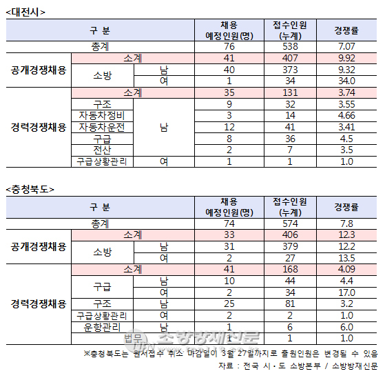 대전시는 이번 소방공무원 76명 모집에 538명이 접수했다고 밝혔다. 이 중 소방(여) 1명을 채용하는 부분에 34명의 지원자가 몰려 34.0:1이라는 가장 높은 경쟁률을 보였다.