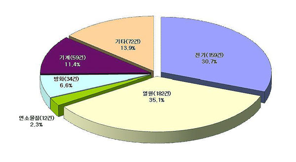 이는 한국화재보험협회에서(이사장 제정무, 이하 화보협)에서 16일 발간한자료에 따른 것으로 화보협은 이 자료를 소방정책 및 화재보험 언더라이팅에 활용할 수 있도록 관계기관과 국내 손해보험사에 배포할 것이라고 밝혔다. ‘2007년도 특수건물 화재조사 분석’은 ‘화재로 인한 재해보상과 보험가입에 관한 법률’ (법률 제2482호 1973.2.6) 제2조제3호 및 동법시행령 제2조제1항에서 정한 특수건물에서 2007년도(1.1~12.31)에 발생한 518건의 화재에 대하여 분석한 것이다. 특수건물이란 다수인이 출입이나 근무 또는 거주하는 국가 주요시설로 11층 이상의 건물과 국유건물, 연면적3,000㎡이상의 공장ㆍ학원ㆍ병원ㆍ방송사업장ㆍ판매시설ㆍ숙박시설ㆍ학교, 16층 이상의 아파트 등을 말한다. 특수건물의 대상건수는 2005년 19,220건과 2006년 20,823건, 2007년에 22,624건이었으며 화재발생건수 및 재산피해액은 2005년 514건에 293억원, 2006년 661건에 89억원, 2007년 518건에 159억원으로 집계됐다.