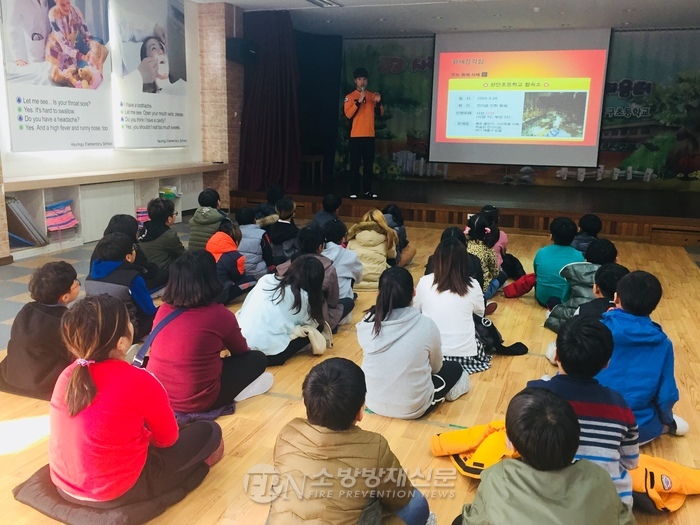 | ▲ 금구초등학교 학생들을 대상으로 화재 예방과 피난대피방법을 교육하고 있다. |
