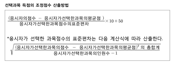 또 수험생이라면 확실하게 알아둬야 할 것이 있다. 바로 ‘조정점수 제도’다. 이 제도는 서로 다른 시험 과목을 선택한 수험생의 성적을 동일한 척도상에서 비교할 수 있도록 하는 것을 말한다. 조정점수 적용 시 가산점 적용대상 수험생은 선택과목 원점수에 가점을 더한 후 조정점수로 환산해 최종 성적을 산출하면 된다.