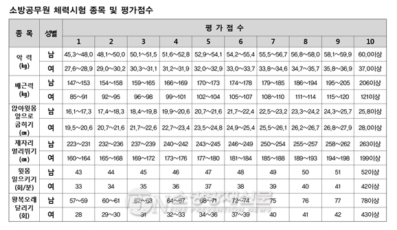 ![]() ▲ 소방공무원 체력시험에서 실시하는 6개 종목과 평가점수다. © 소방방재신문 |