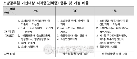 ![]() ▲ 소방공무원 시험에 적용되는 가산점 종류와 가점 비율이다. © 소방방재신문 |