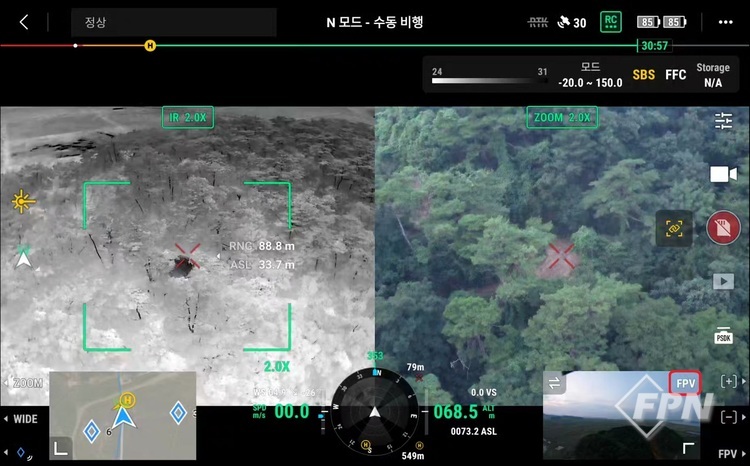 하지만 M30T는 161° 화각으로 볼 수 있는 FPV카메라가 기체 정면에 별도 설치돼 있어 실종자 수색에 필요한 영상정보와 비행 방향의 장애물을 감지하고 회피하기 위한 영상정보를 동시에 확인할 수 있다.